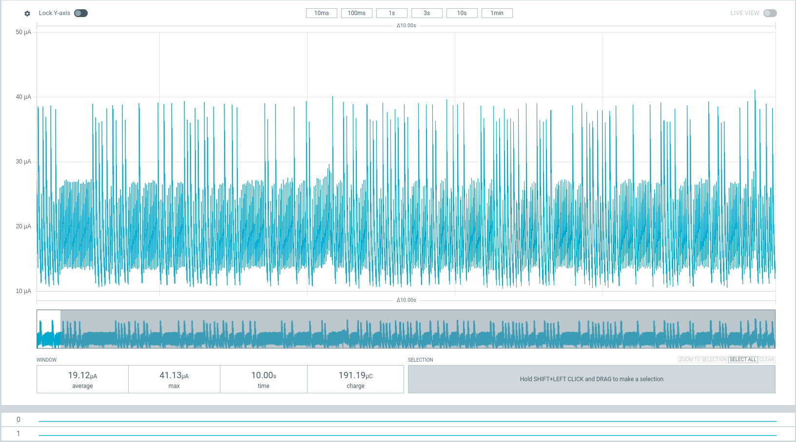 These are measurements for the figures in Current Consumption. These were measured using Nordic Power Profiler Kit II (a.k.a PPK2) acting as a battery @3.7 V plugged into BATP and BATN; and with no external supply (VUSB or VDC).